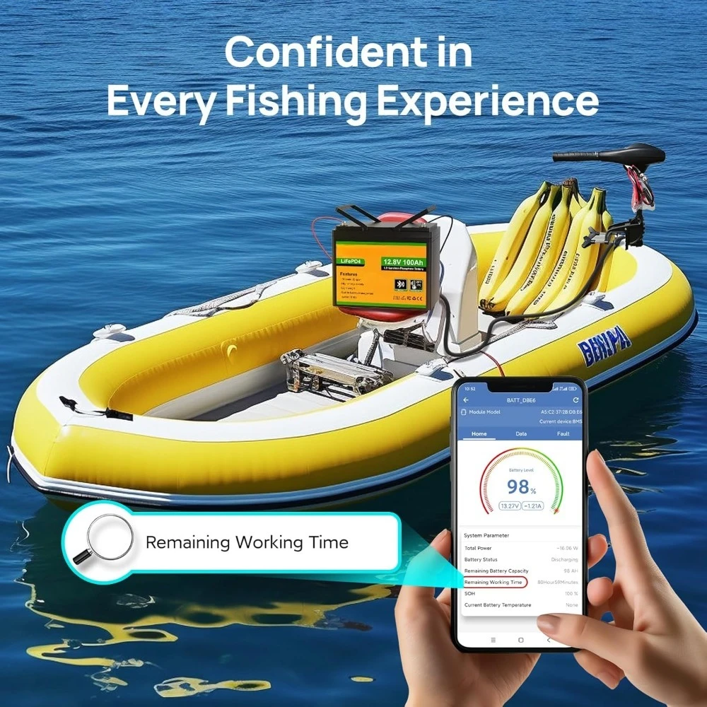 This 12V 100AH LiFePO4 lithium battery provides reliable energy storage for multiple applications. Bluetooth connectivity allows monitoring of battery status from your device. Maximum energy capacity of 1280Wh supports extended power needs. Low temperature protection ensures safe operation in cold environments. Marine-grade design makes it suitable for boats and outdoor use. Comes with a 100A battery management system for safety and performance. Lightweight and portable compared to traditional lead-acid batteries. Ideal for camping, RV, marine, and backup power systems. Durable construction ensures long-lasting performance in rugged conditions. This battery combines efficiency, safety, and portability for reliable energy on the go.
