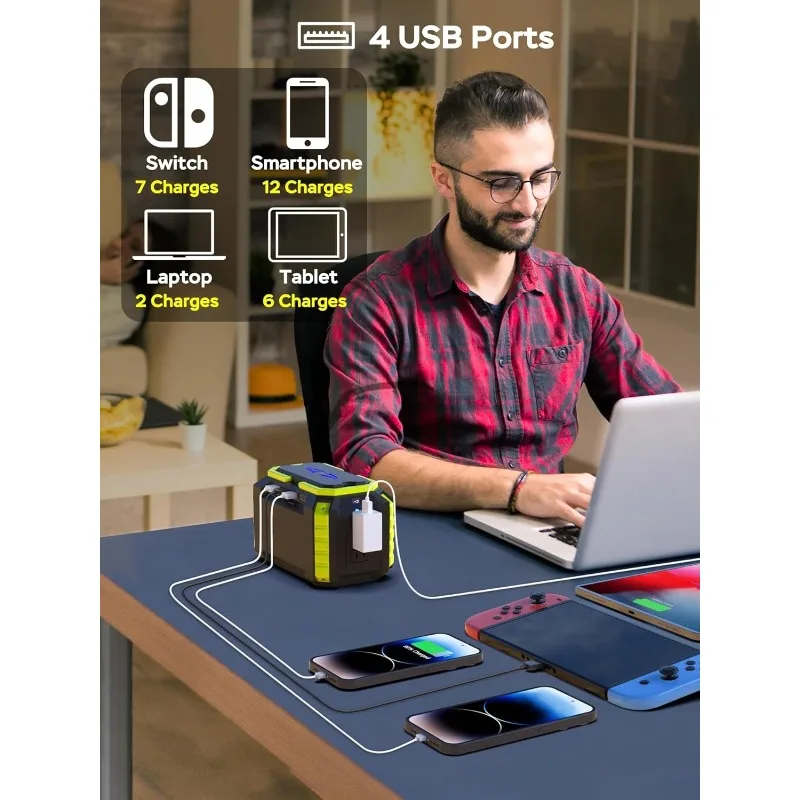 This 150Wh portable power station provides reliable energy for camping, travel, and emergencies. Equipped with AC outlet and 4 USB ports for charging multiple devices. Compact and lightweight design makes it easy to carry. Ideal for laptops, phones, lights, and small electronics. Solar-compatible for off-grid charging using a compatible panel. Peak output of 150W ensures efficient power delivery. Safe and reliable operation with built-in protections. Perfect for outdoor adventures, camping trips, or backup home power. Durable construction withstands rugged outdoor conditions. Combines portability, versatility, and convenience for off-grid power needs.