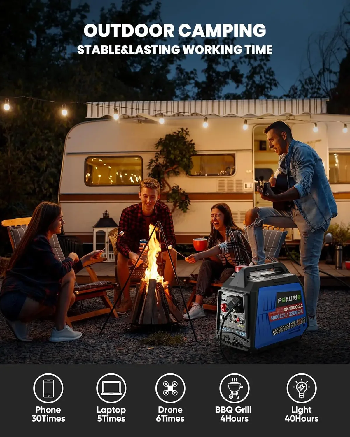 This 4000W inverter generator provides reliable power for camping, RVs, and home backup. Super quiet operation makes it ideal for outdoor and residential use. Gas-powered design ensures long-lasting performance. EPA-compliant operation meets environmental standards. Built-in CO alarm enhances safety during use. RV-ready outlets make it convenient for recreational vehicles. Compact and portable for easy transport and storage. Provides stable 120V power for electronics and appliances. Durable construction withstands outdoor conditions and frequent use. This generator delivers dependable, efficient, and safe power for all your needs.