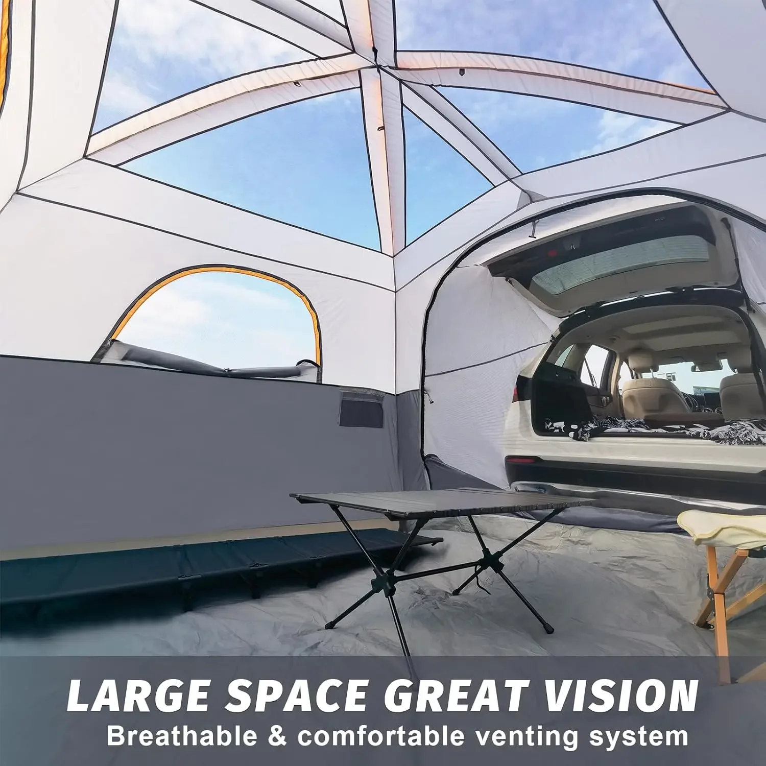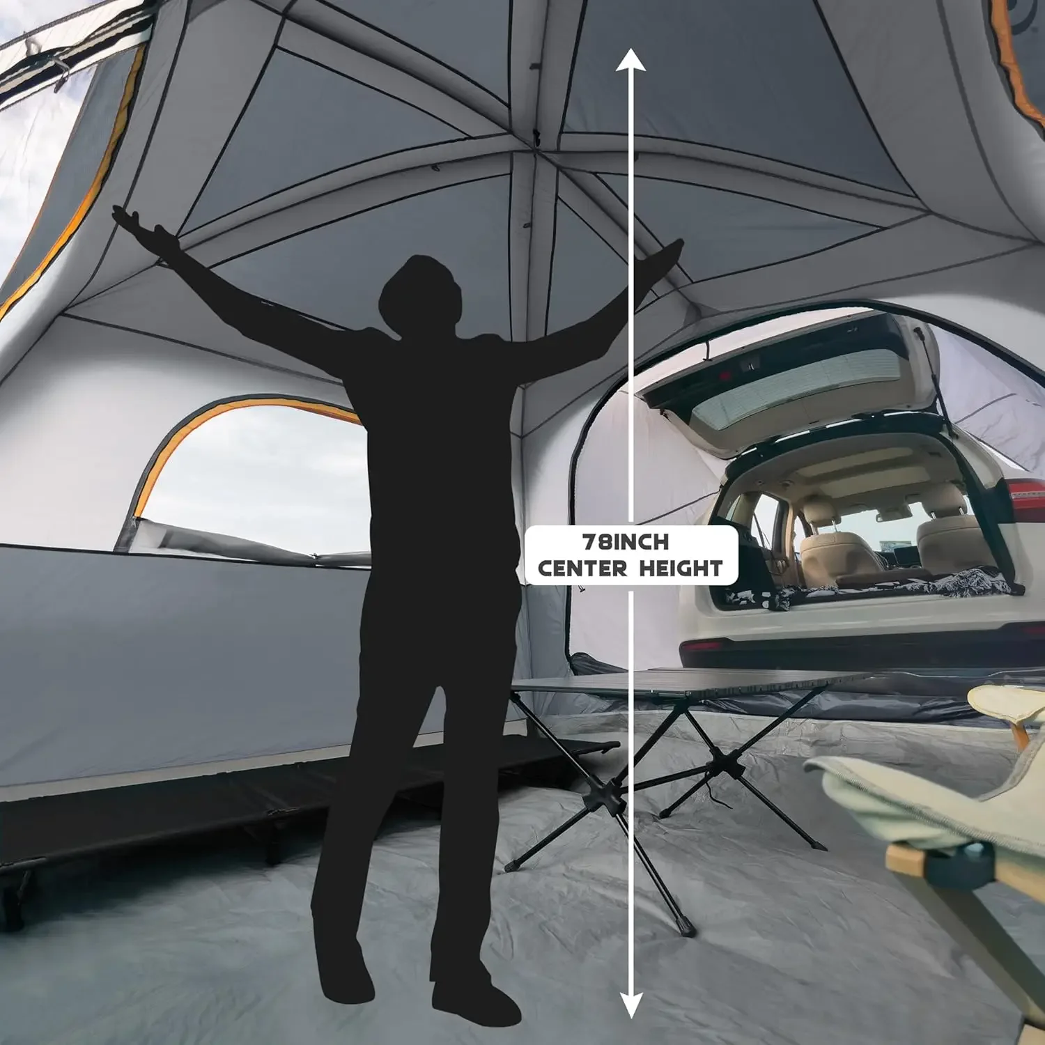 This 6-person SUV tailgate tent is perfect for camping adventures. Easy setup with included rainfly provides protection from rain and sun. Spacious interior measures 10’x9’x78″H, comfortably accommodating six people. Designed to attach to your SUV for convenient tailgate access. Durable materials ensure long-lasting performance in outdoor conditions. Lightweight and portable for easy transport and storage. Ventilation panels enhance airflow while maintaining privacy. Ideal for camping trips, festivals, or road trips. Sturdy construction ensures stability on uneven surfaces. This tent combines convenience, protection, and comfort for outdoor enthusiasts.