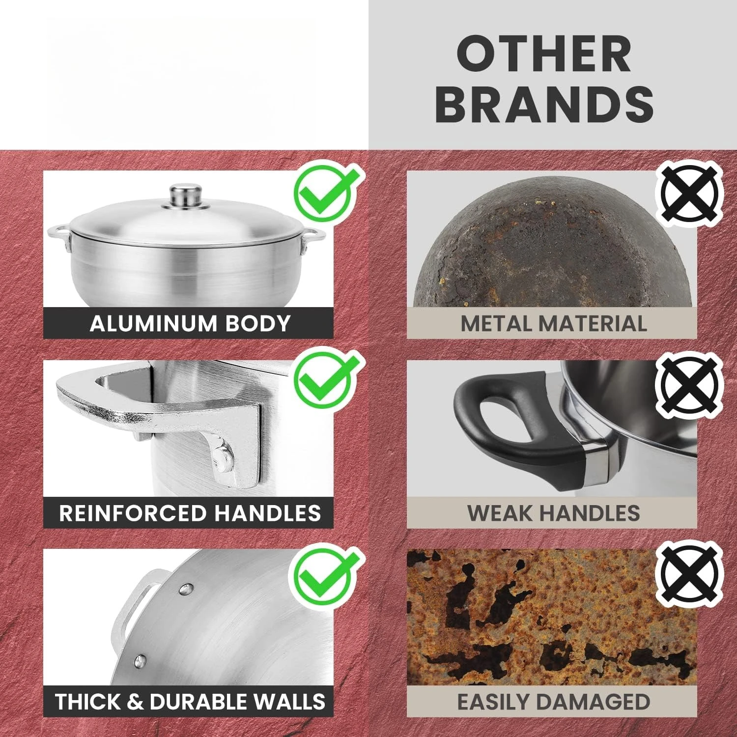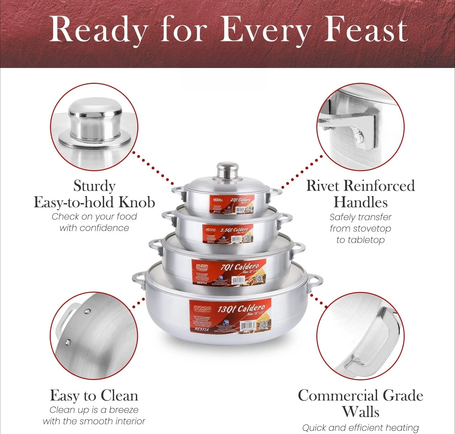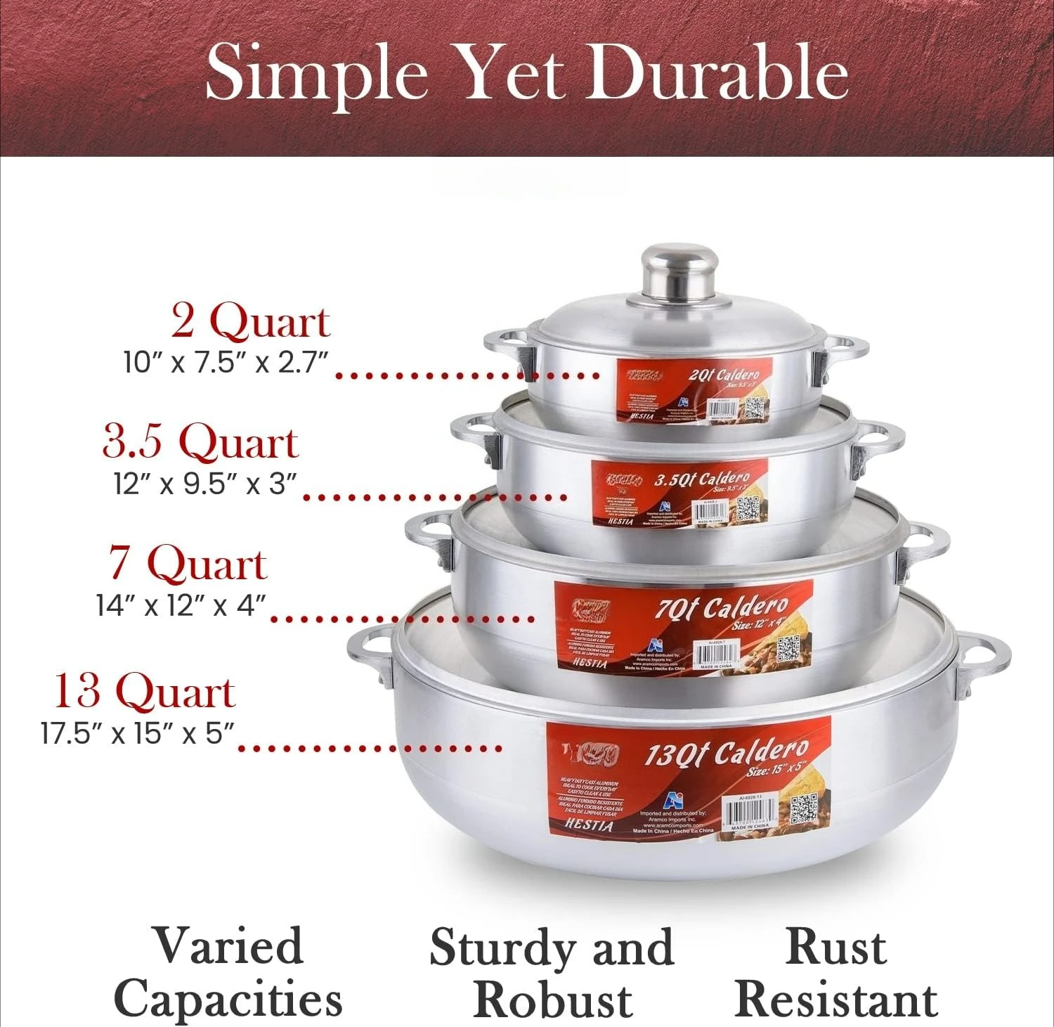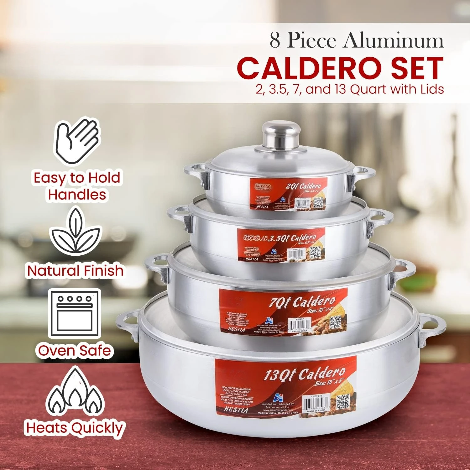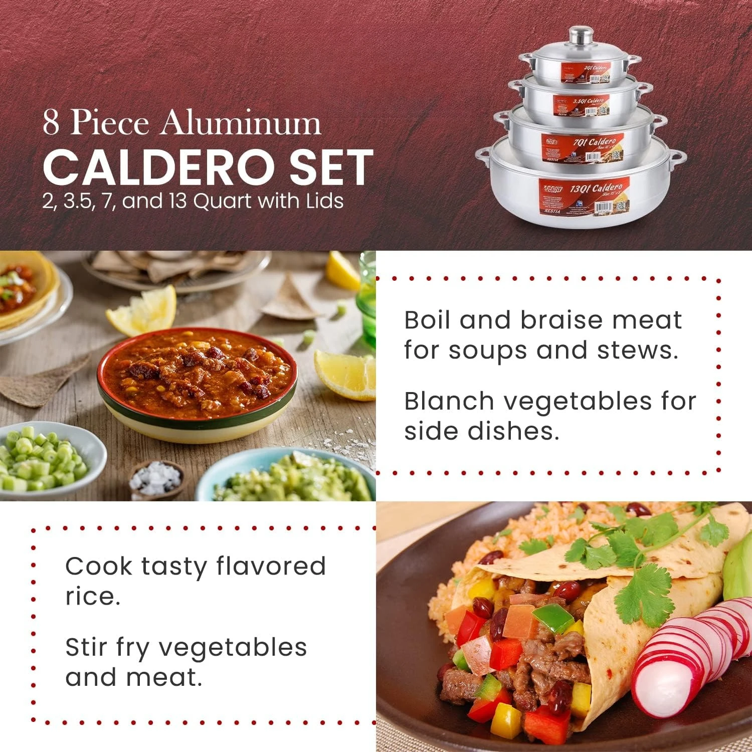 This 8-piece aluminum caldero set is perfect for everyday home cooking. Durable nonstick coating ensures easy food release and cleaning. Includes multiple stock pots with matching lids for versatile cooking options. Aluminum construction provides even heat distribution. Ideal for soups, stews, rice, and other dishes. Lightweight yet sturdy for comfortable handling. Suitable for daily use in any kitchen. Lids fit securely to retain heat and moisture. Stylish and functional design enhances your cooking experience. This cookware set combines durability, versatility, and convenience for all cooking needs.
