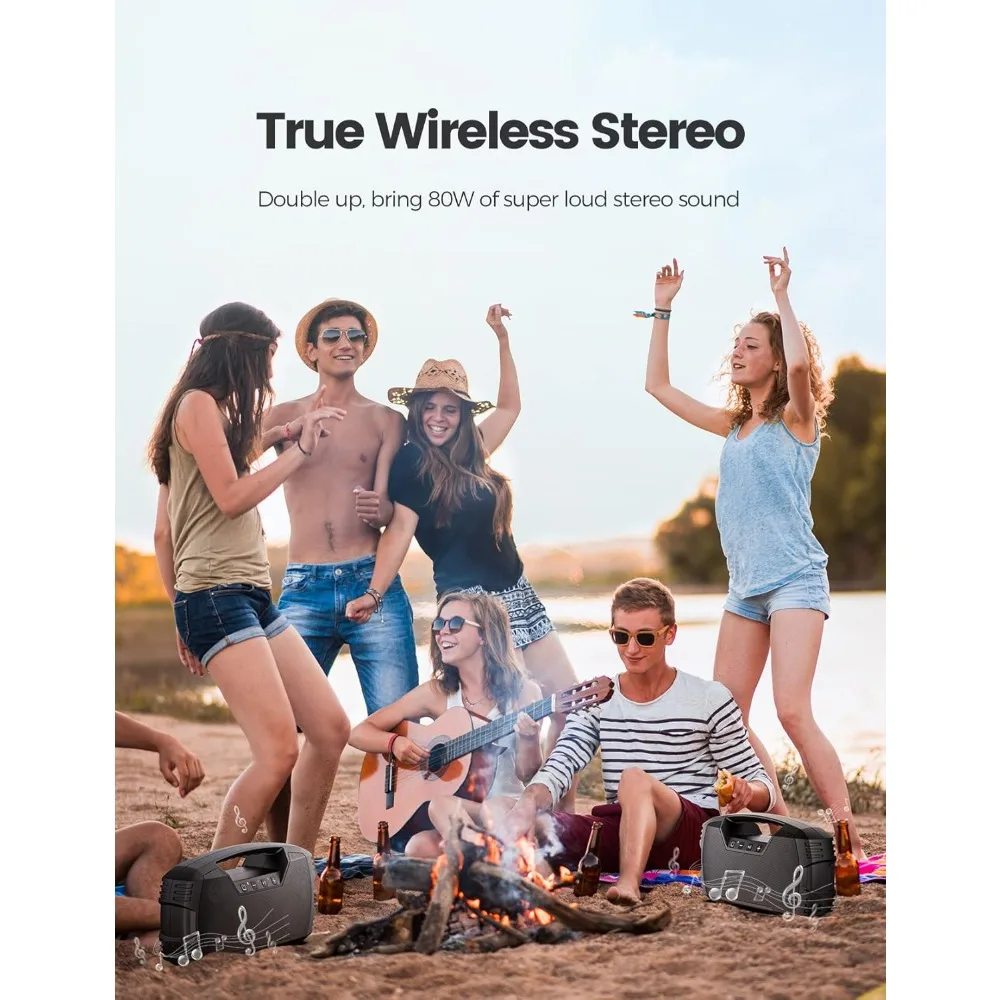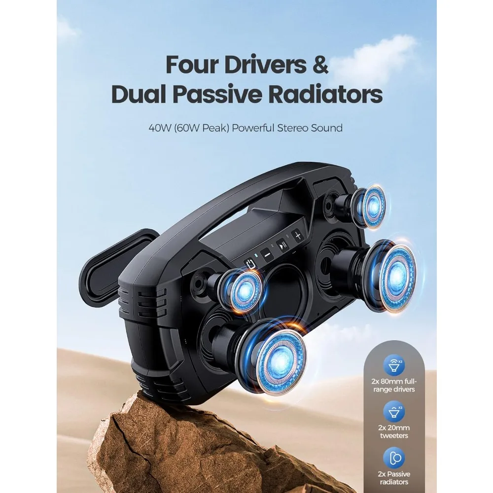 This IPX7 waterproof Bluetooth speaker delivers 40W (60W peak) of powerful sound. Features built-in subwoofer for deep bass and stereo clarity. Portable design makes it perfect for outdoor use, travel, or home. Wireless connectivity allows easy pairing with phones, tablets, or laptops. Long 32-hour playtime ensures uninterrupted listening. IPX7 waterproof rating protects against splashes, rain, or poolside use. Compact yet durable construction withstands outdoor conditions. Easy-to-use controls for volume, playback, and Bluetooth settings. Ideal for parties, camping, or beach outings. Combines powerful sound, portability, and water resistance for versatile audio enjoyment.