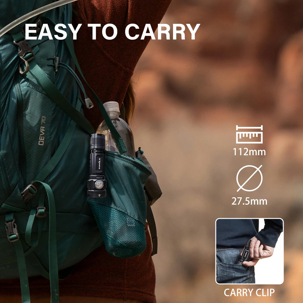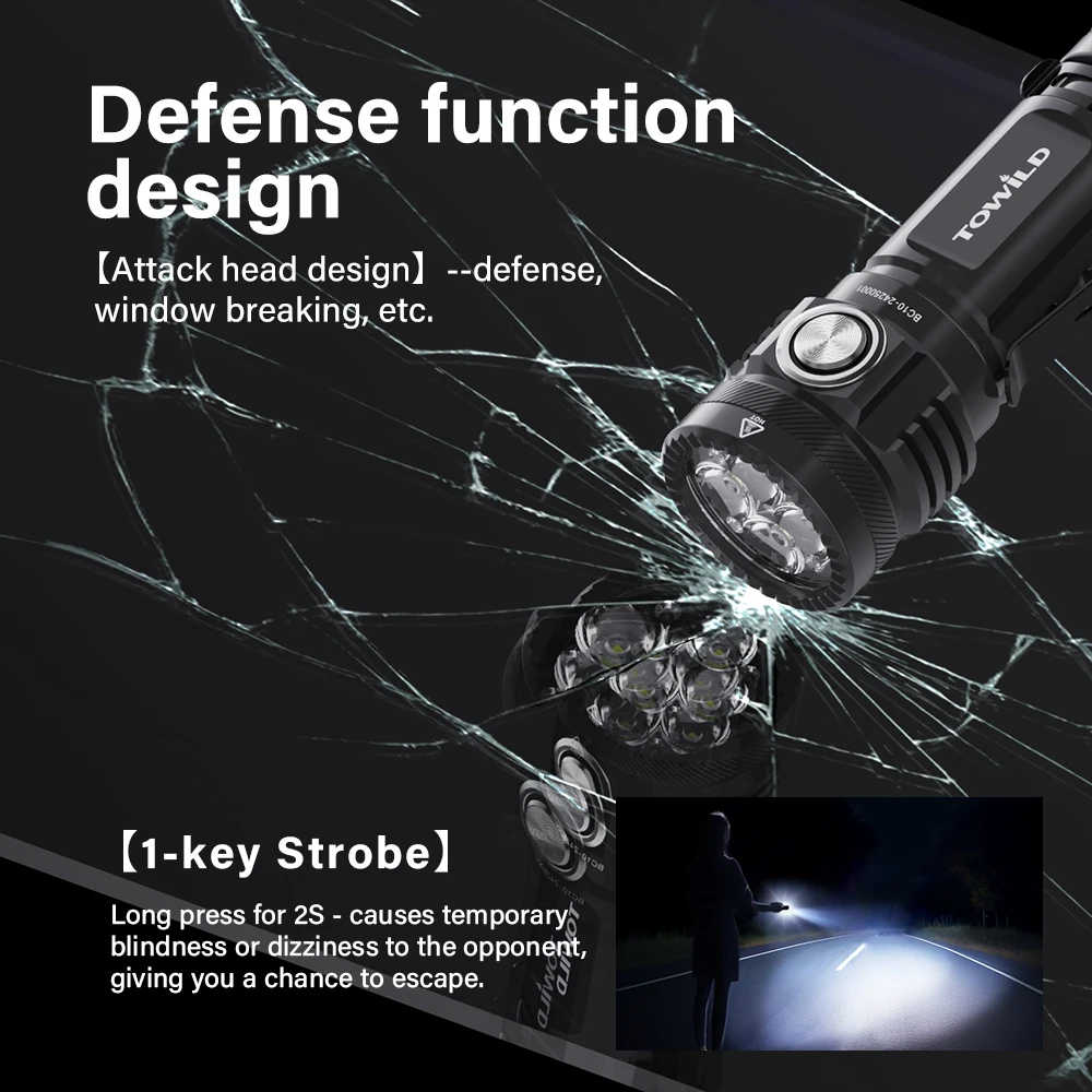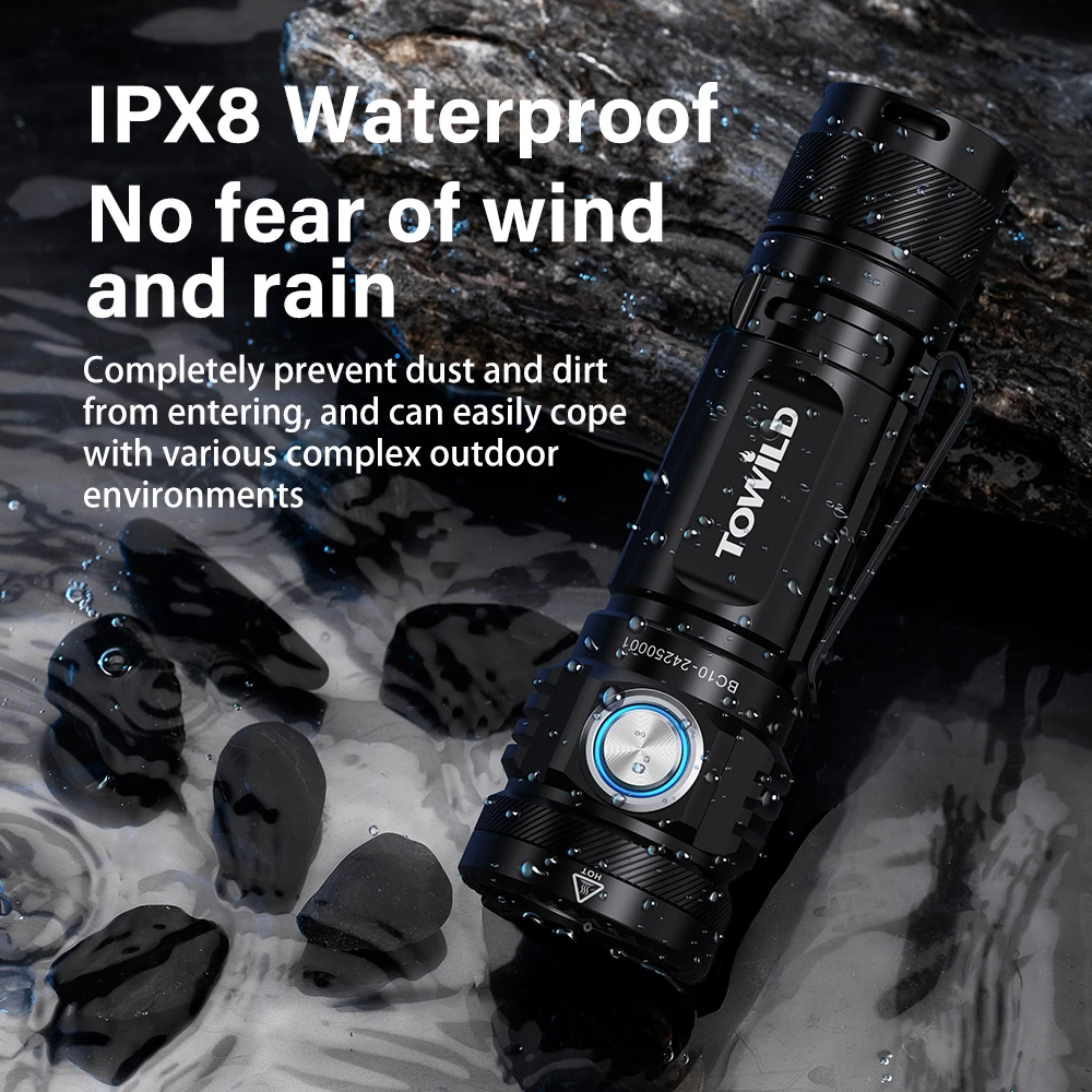 The TOWILD BC10 is a portable, rechargeable EDC flashlight delivering 4000 lumens of bright light. IPX8 waterproof rating ensures reliable performance in wet conditions. Uses a 21700 battery for long-lasting power and durability. Compact and lightweight design makes it easy to carry for outdoor activities. High-power LED provides intense illumination for camping, hiking, or emergencies. Multiple modes allow adjustable brightness and beam focus. Sturdy construction ensures durability under rough conditions. Quick recharge capability adds convenience for frequent use. Ideal for outdoor lighting, survival, and tactical applications. Combines portability, power, and reliability in a versatile flashlight.